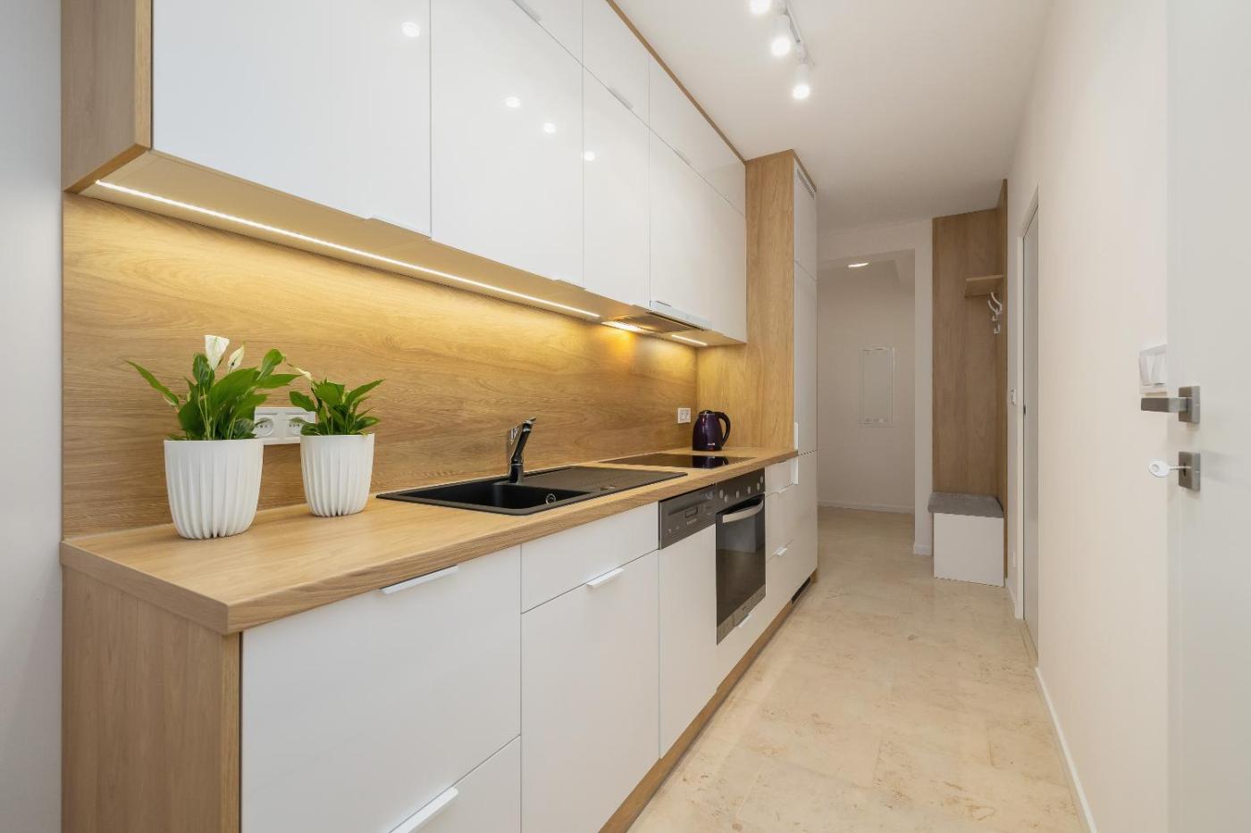 W apartamencie zapewniono sypialnię (1), kuchnię z lodówką i piekarnikiem, a także łazienkę (1) z prysznicem, suszarką do włosów oraz pralką. W apartamencie zapewniono ręczniki i pościel.