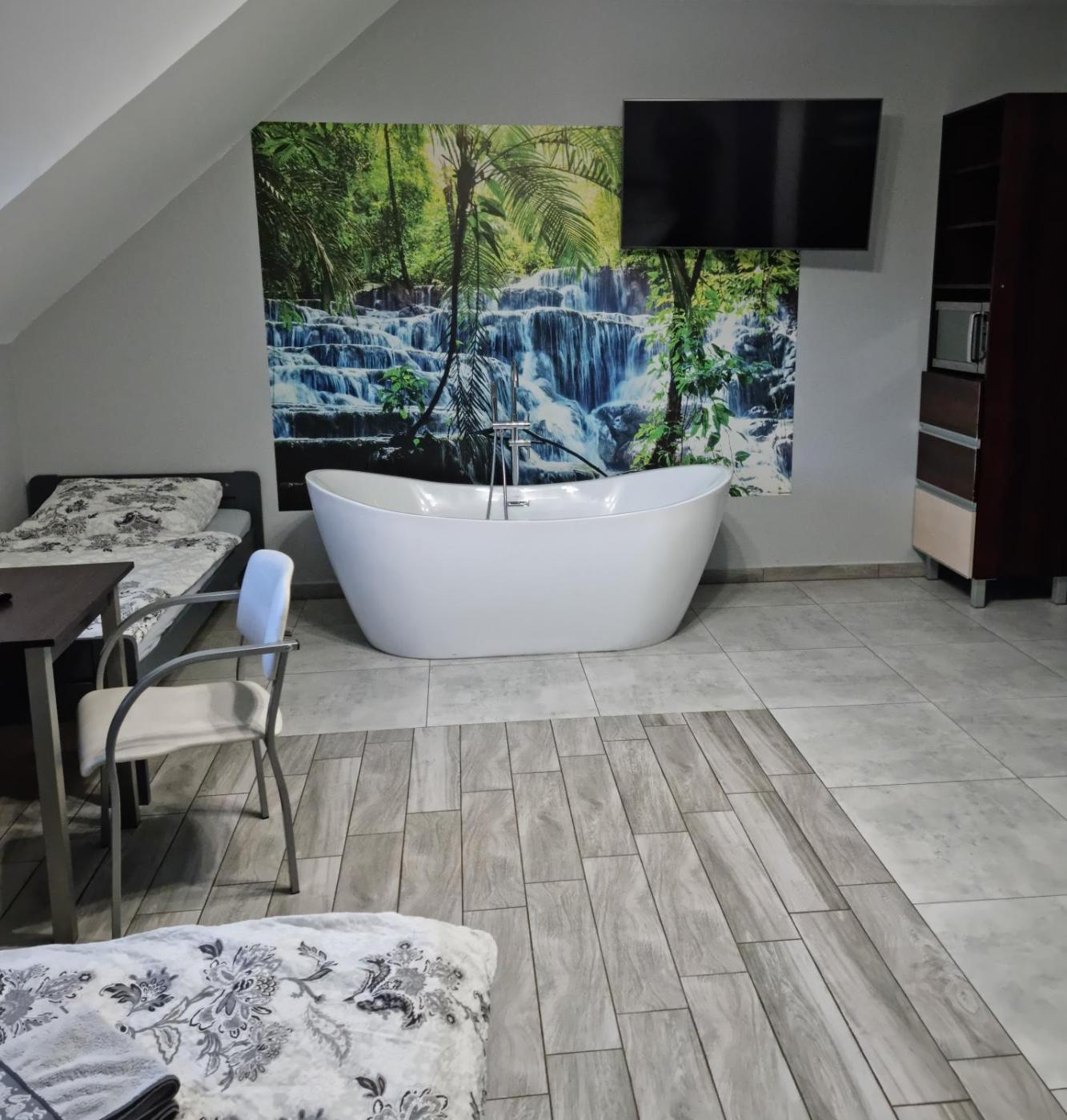 Pokój Dwuosobowy typu Deluxe z wanną. The double room offers air conditioning, a tea and coffee maker, as well as a private bathroom featuring a bath and a shower. Guests will find a stovetop, a refrigerator, kitchenware and a microwave in the well-fitted kitchen. The double room also has a barbecue. The double room features a dining area, a wardrobe, a tiled floor, a flat-screen TV, as well as garden views. The unit offers 2 beds. Pokój Dwuosobowy - 3 osobowy. Powierzchnia pokoju ok.: 25 mkw.