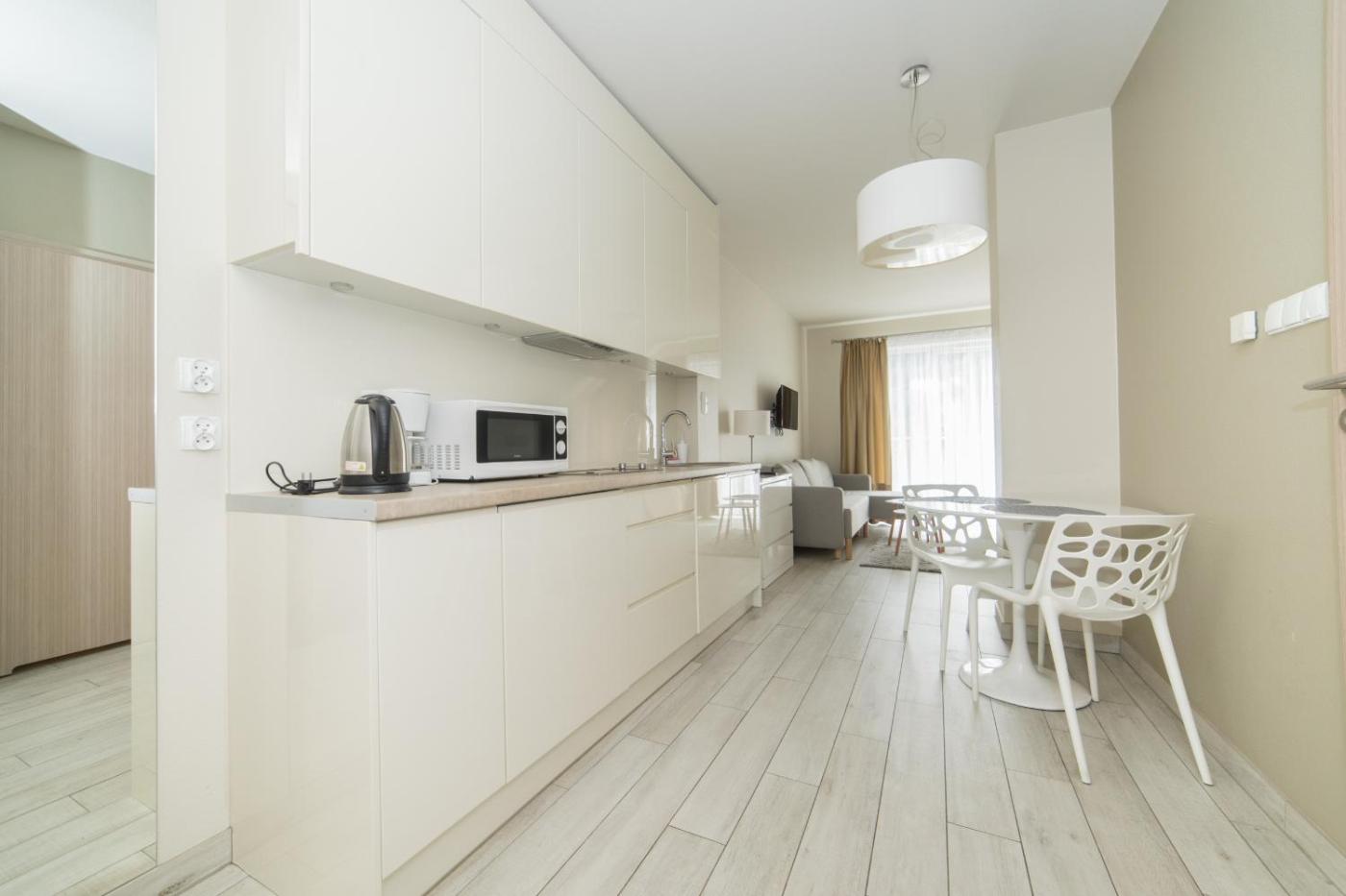 Apartament typu studio. This apartment comprises 1 bedroom, a kitchenette and 1 bathroom with a shower and a hairdryer. Meals can be prepared in the kitchenette, which is equipped with a stovetop, a refrigerator, a dishwasher and kitchenware. The apartment provides a coffee machine. The unit offers 2 beds. Apartament - 4 osobowy. Powierzchnia pokoju ok.: 35 mkw.
