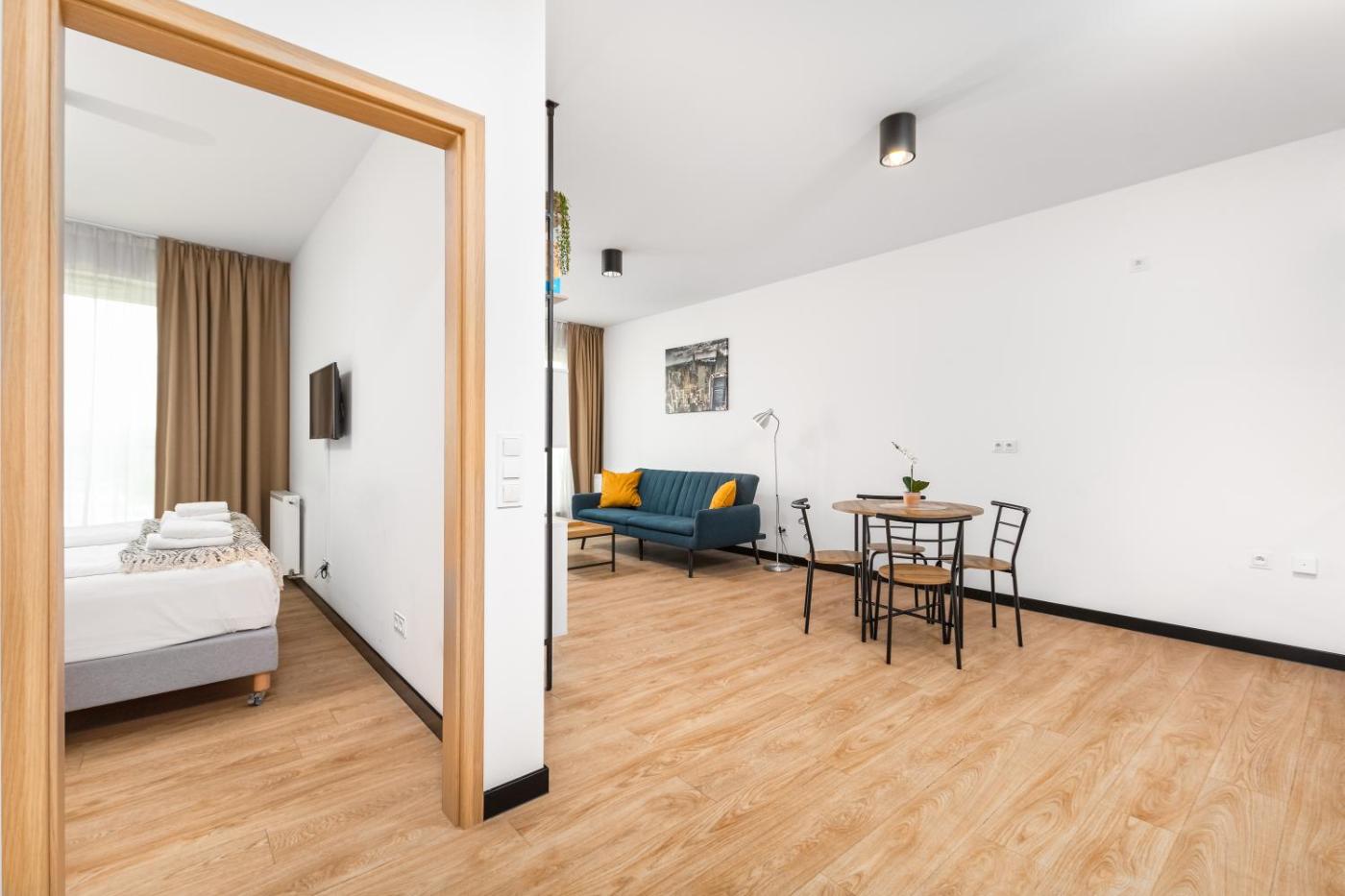 Apartament z 1 sypialnią. This air-conditioned apartment consists of 1 living room, 1 separate bedroom and 1 bathroom with a bath. Guests can make meals in the kitchen that is equipped with a stovetop, a refrigerator, a dishwasher and kitchenware. The apartment provides a flat-screen TV, a dining area, a wardrobe, an electric kettle as well as city views. The unit offers 2 beds. Apartament - 3 osobowy. Powierzchnia pokoju ok.: 50 mkw. ;